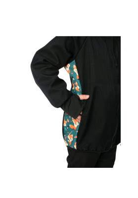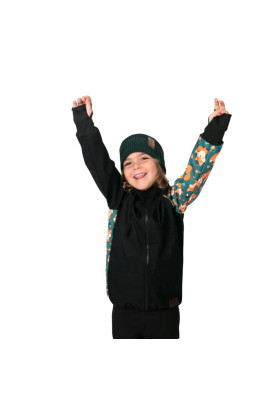 Bunda má prodloužený střih, který chrání záda před ofouknutím, a široké náplety s dírou na palec, díky nimž rukávy dobře drží a zahřejí i část ruky. Prostorná kapuce se stahováním ochrání před deštěm a větrem, zatímco skryté boční kapsy pojmou kapesník, rukavice nebo nasbírané poklady z přírody. Design doplňují originální grafické prvky umístěné na jednom rukávu a boku.