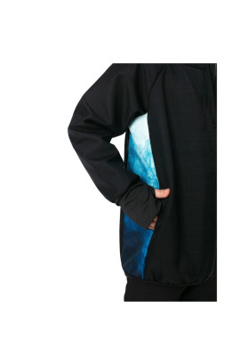 Bunda má prodloužený střih, který chrání záda před ofouknutím, a široké náplety s dírou na palec, díky nimž rukávy dobře drží a zahřejí i část ruky. Prostorná kapuce se stahováním ochrání před deštěm a větrem, zatímco skryté boční kapsy pojmou kapesník, rukavice nebo nasbírané poklady z přírody. Design doplňují originální grafické prvky umístěné na jednom rukávu a boku.