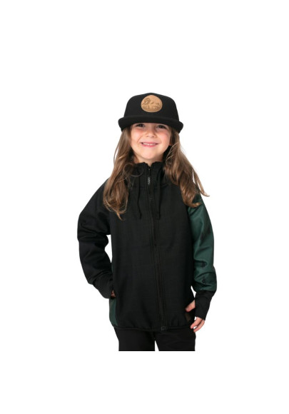 Bunda má prodloužený střih, který chrání záda před ofouknutím, a široké náplety s dírou na palec, díky nimž rukávy dobře drží a zahřejí i část ruky. Prostorná kapuce se stahováním ochrání před deštěm a větrem, zatímco skryté boční kapsy pojmou kapesník, rukavice nebo nasbírané poklady z přírody. Design doplňují originální grafické prvky umístěné na jednom rukávu a boku.