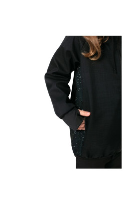 Bunda má prodloužený střih, který chrání záda před ofouknutím, a široké náplety s dírou na palec, díky nimž rukávy dobře drží a zahřejí i část ruky. Prostorná kapuce se stahováním ochrání před deštěm a větrem, zatímco skryté boční kapsy pojmou kapesník, rukavice nebo nasbírané poklady z přírody. Design doplňují originální grafické prvky umístěné na jednom rukávu a boku.