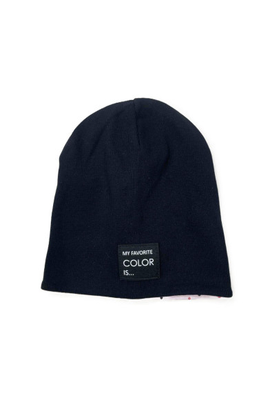 Dívčí oboustranná celoroční čepice. Z jedné strany potisk puntíků, druhá strana jednobarevná, žebrový úplet.