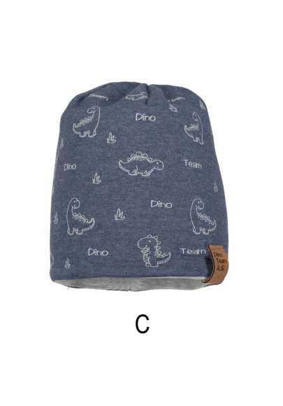 Chlapecká celoroční oboustranná čepice s potiskem dinosaura. Z druhé strany jednobarevná.