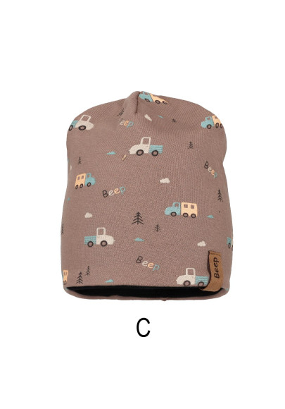 Chlapecká celoroční oboustranná čepice s potiskem autíček. Z druhé strany jednobarevná.