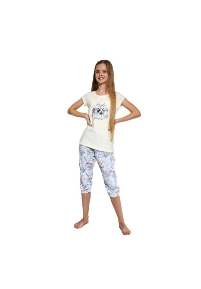 Dívčí pyžamo s krátkým rukávem a kalhotami pod kolena, spodní část kalhot stažena do pružného lemu, všívaná široká guma v pase kalhot. Pyžamo je vyrobeno ze 100% bavlněného úpletu.