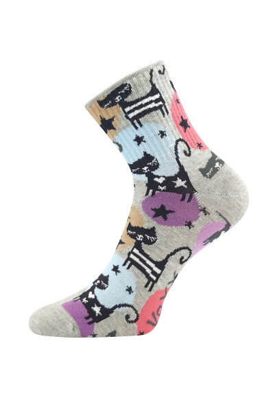 Veselé ponožky mají špičku ponožky uzavřenou náročnějším řetízkováním, díky kterému je spoj dokonale hladký a nehrozí, že ponožka bude tlačit. Lem ponožek je extra jemný a nestahující, vysoký podíl bavlny je příjemný na nošení. Tenké ponožky ve střední výšce mají obrázkové motivy, v teplotní třídě A je můžete nosit v rozmezí teplot od +10°C do +35°C.
